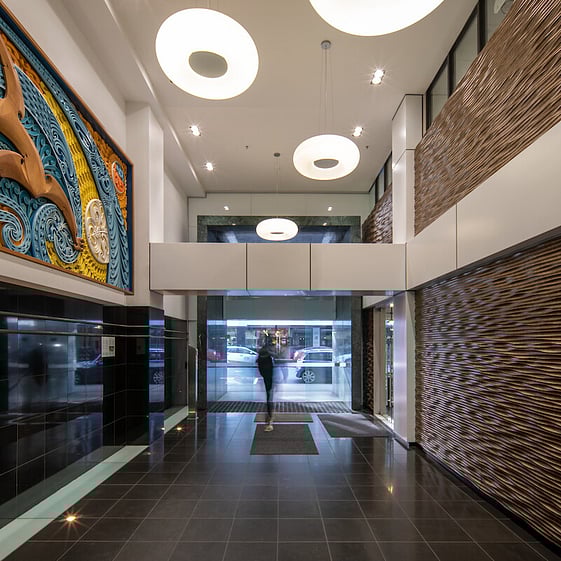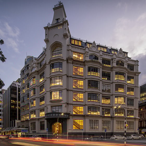 A modern 8-level office building, with a character façade which comprises two integrated buildings. Located in Wellington’s prime office CBD, close to Wellington’s retail “Golden Mile” Lambton Quay and Wellington’s stunning waterfront. 36 secure, onsite carparks. The original eight-storey building at 110 Featherston Street was built in 1917 by James Fletcher for the Dominion Farmers Institute. It was then partly demolished, extended, strengthened and combined with a new nine-storey structure in 1985. The two structures are connected by an attractive central atrium and the historic façade is part of the original building. It is registered as a category II with Historic Places and is listed in the heritage chapter. Some ground floor retail, a mezzanine floor, seven levels of office space and basement parking. The building is serviced by three lifts, with one descending to the basement. The lift plant room and other service facilities are located on the roof. Two new chillers were installed and commissioned in October 2017. The building has retail frontage to Featherston Street, the main entrance lobby is also on Featherston Street with secondary access for servicing, vehicle and pedestrian access from Maginnity Street. The office floors average approximately 1,150sqm with lifts, stairs, toilets, and service core located towards the southern side of the building. The space is carpeted and air conditioned with excellent natural light augmented by lighting recessed in suspended ceiling tiles. The ground floor has male and female showers and there is secure storage for bicycles in the basement.